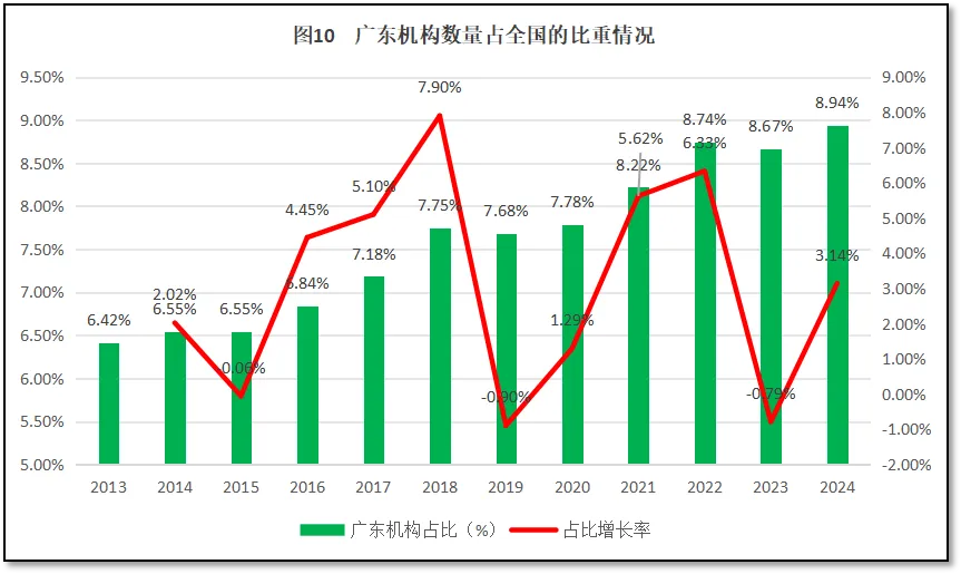 截至2024年末,广东省检验检测机构数量为4745家,约占全国检验检测机构数量的8.94%,位居全国第一。过去12年,广东省检验检测机构数量在全国检验检测行业中的占比以及占比的增长率如图10所示。