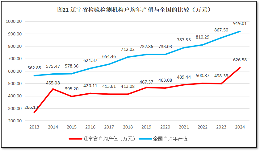 辽宁省检验检测机构户均营业收入与全国情况的比较如图21所示。